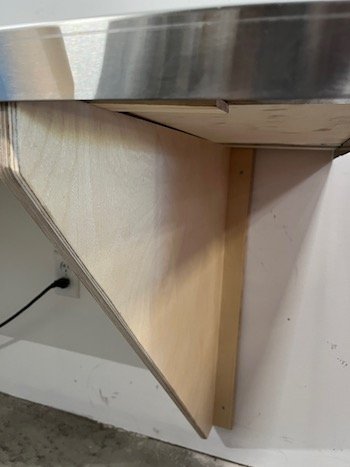We used an 8 foot long stainless steel table top. This was reinforced underneath with high quality baltic birch plywood. Rather than using standard legs, we hung the top from the wall on a ledger, with triangular reinforcing brackets. The brackets are up off the floor by a few inches.